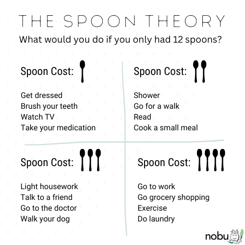 Spoons? Yes, this analogy was created by Christine Miserandio to describe the physical and mental energy tasks taken when you are struggling with chronic mental or physical illnesses. Most healthy people have unlimited opportunities and don’t have to think about the extreme mental and physical energy that most basic tasks can take. We often start the day with fewer ‘spoons’ and each task takes spoons away. We have to plan where we are going to spend our energy, and you aren’t always guaranteed to start tomorrow with the same spoons as today. And borrowing spoons from tomorrow is how you have a chronic illness flare up, get burnt out, or hit your mental breaking point. It can be very stressful trying to figure out where you can give spoons or if you will even have enough, but stressing takes away even more spoons. I would highly recommend reading the full story here: https://butyoudontlooksick.com/articles/written-by-christine/the-spoon-theory/